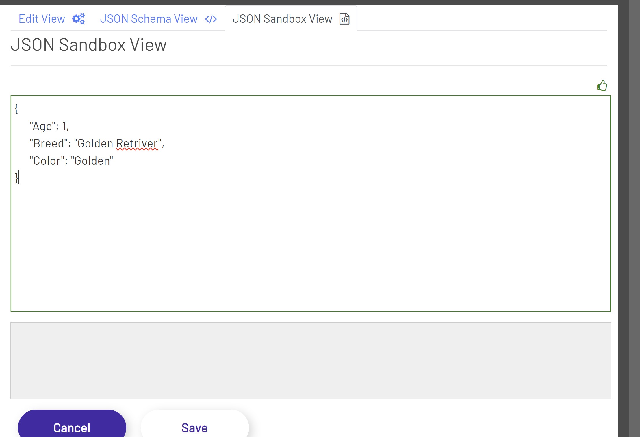 The JSON Sandbox view allows us to validate that a user inputted JSON object satisfies the type that we have defined in the Edit View. Here, we can enter Json and we will get validation messages that tell us whether or not the object we entered satisfies our type. Below is an example that satisfies the dog type that we have defined. Here, we have no error messages but just a green border that tells us the entered JSON is valid.